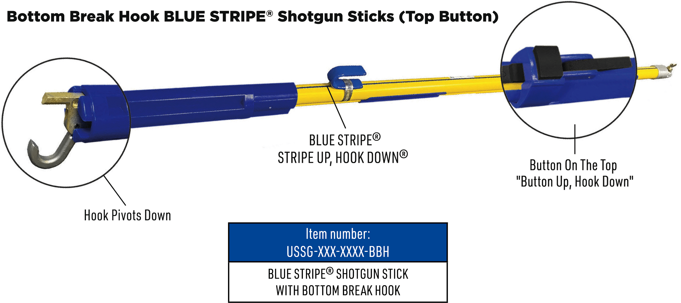 All BLUE STRIPE® Shotgun Sticks are available with two distinct operating handle orientations. The variations include a version with a side button (Standard) with the hook pivoting down and a bottom break hook (BBH) version.