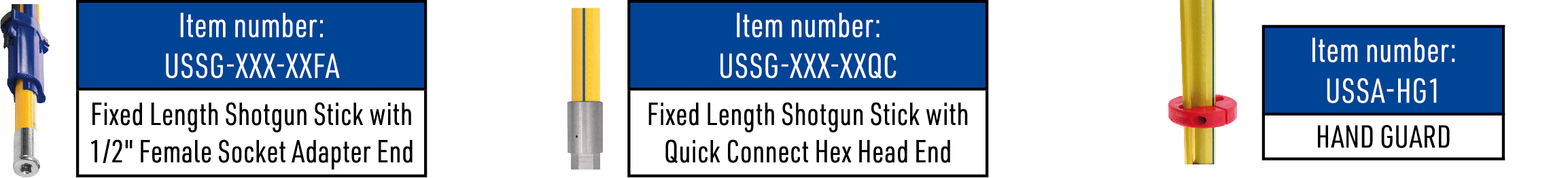 BLUE STRIPE® Telescopic Shotgun Sticks are available from 5’ to 14’. Various end fitting configurations are available. Our patent pending BLUE STRIPE® Telescopic Shotgun Sticks feature an innovative and simplified button solution for extending to operating lengths.