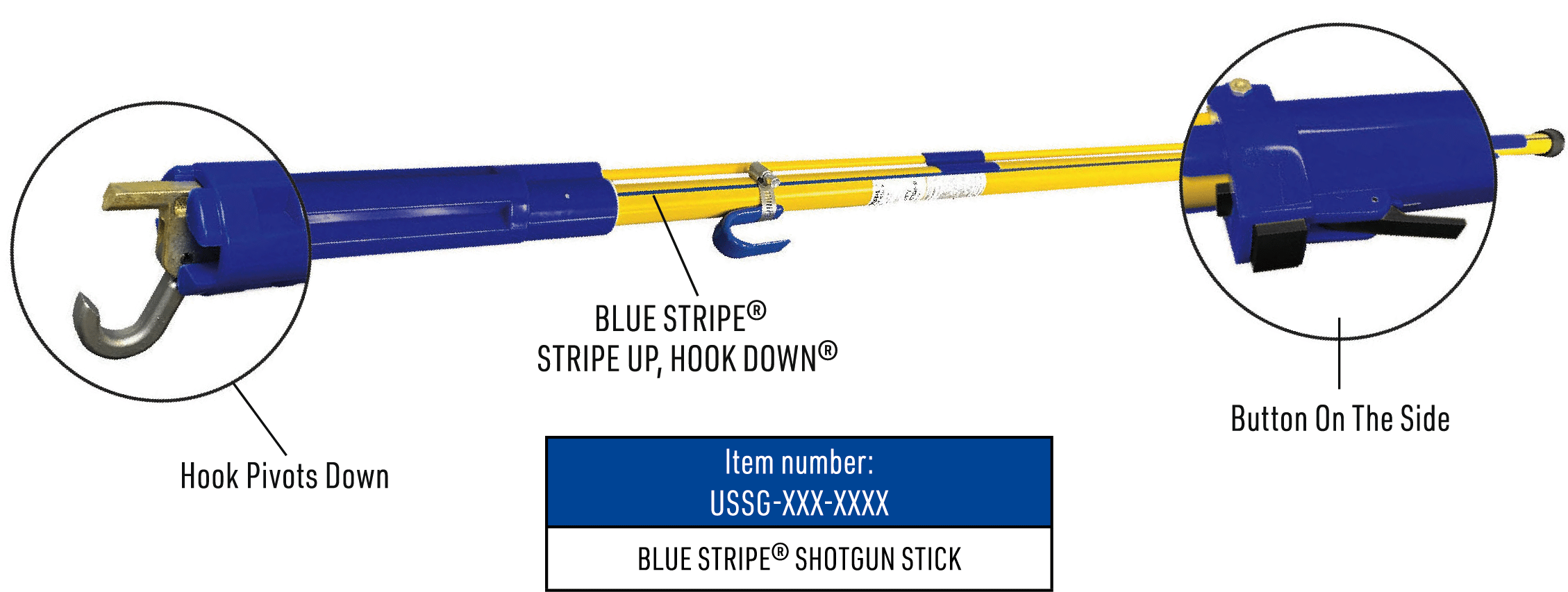 BLUE STRIPE® Shotgun Sticks are available in both internal and external rod, from 4’ to 12’. Various end fitting configurations are available. Our BLUE STRIPE® Shotgun Sticks offer an innovative STRIPE UP, HOOK DOWN® feature. When the stripe is up, the stainless steel hook opens downward, minimizing accidental drops.