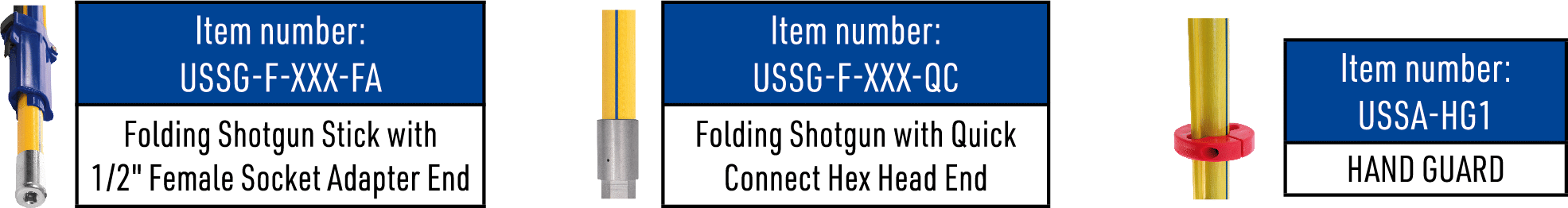 BLUE STRIPE® Folding Shotgun Sticks are available from 6’ to 16’. Various end fitting configurations are available. Our BLUE STRIPE® Folding Shotgun Sticks feature an ergonomic and fast method of deployment; simply open the stick and lock into place for fast and convenient use.