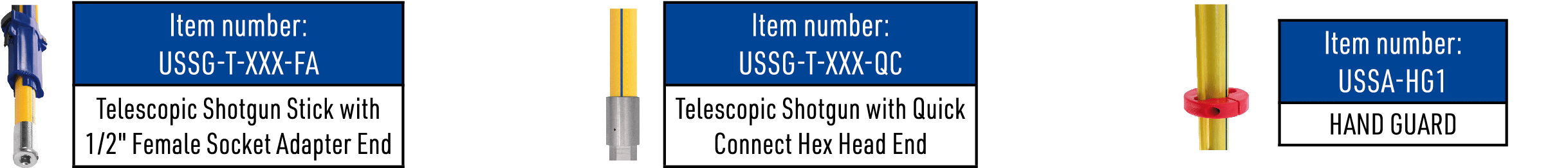 BLUE STRIPE® Telescopic Shotgun Sticks are available from 5’ to 14’. Various end fitting configurations are available. Our patent pending BLUE STRIPE® Telescopic Shotgun Sticks feature an innovative and simplified button solution for extending to operating lengths.